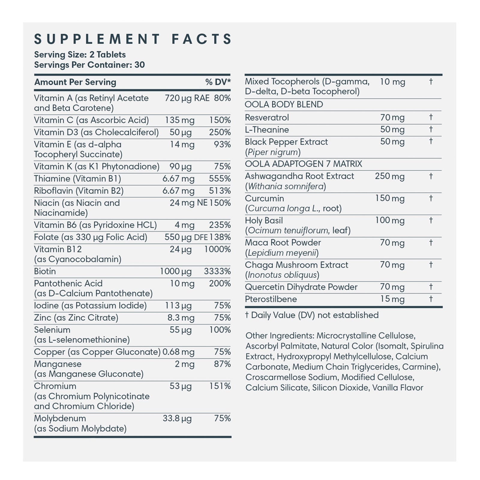 Elevate your physical and mental well-being to new heights with Oola Body, a groundbreaking multivitamin infused with the exclusive Adaptogen 7 Matrix, specifically formulated to combat stress and enhance resilience. This potent blend of essential nutrients and powerful adaptogens works synergistically to support your body's natural stress response, boost immune function, and maintain optimal health.
